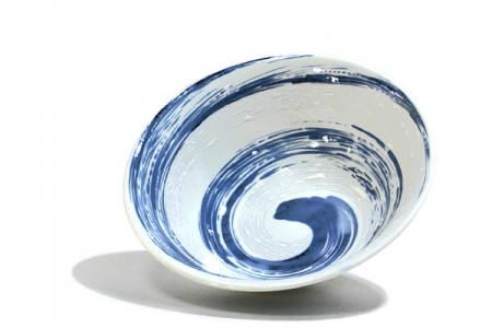 Coupe évasée blanche, décoré d'une spirale bleue.