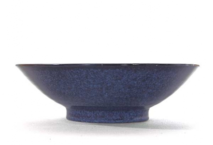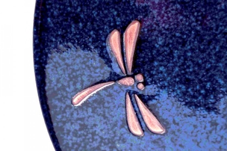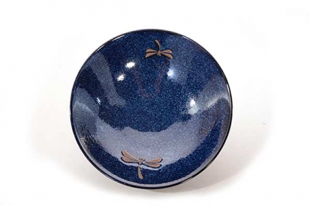 Belle coupe japonaise bleue en porcelaine émaillée, mouchetée avec deux libellules incrustées.