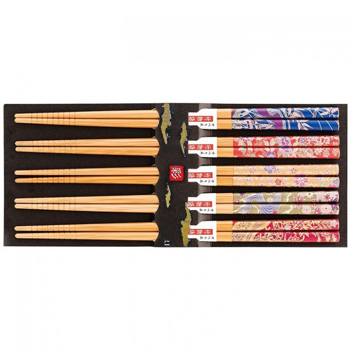 Set de cinq paires de baguettes japonaises en bois avec décor inspiré de la tradition.