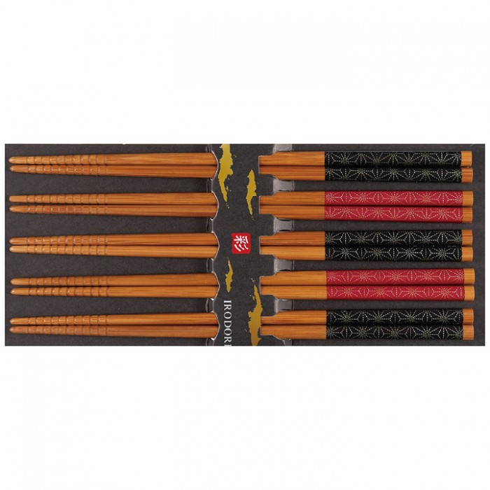 Set de 5 paires de baguettes japonaises en bois avec décor inspiré de la tradition.