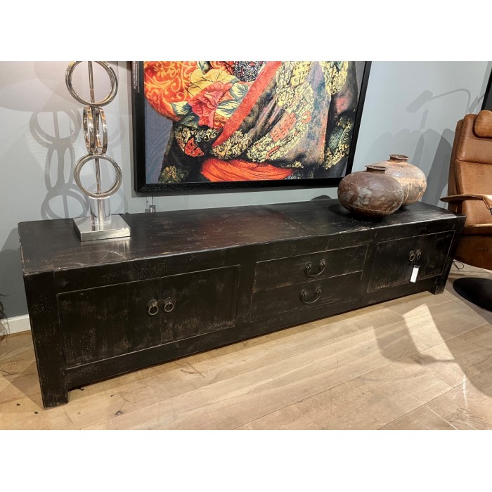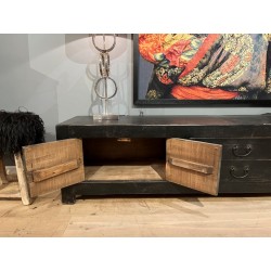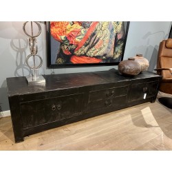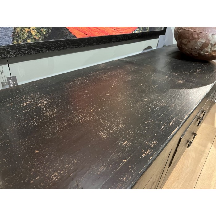 Buffet bas noir avec 4 portes et 2 tiroirs, en vieux bois de pin.