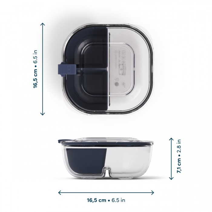 Son récipient est équipé d’une légère délimitation qui viendra caler les 2 caissettes amovibles, pour simplifier la compartimentation de votre repas. 100% hermétique, cette lunch box accueillera tous vos plats gourmands dans sa capacité généreuse de 850 ml !