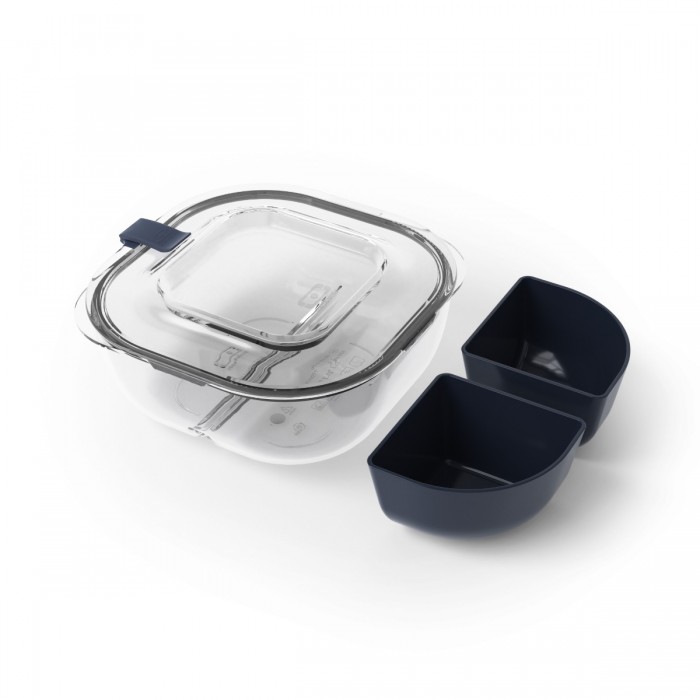 1 couvercle (Tritan™) - 1 récipient (Tritan™) - 1 joint bi-injecté (SEBS) - 1 bouchon bi-injecté (SEBS) - 2 caissettes (Tritan™)
