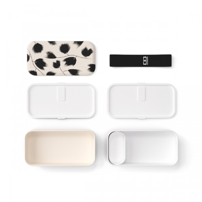 1 couvercle (PBT) - 2 récipients (PBT) - 2 couvercles intermédiaires + leurs joints (PP + SEBS) - 2 bouchons (silicone) - 1 élastique (élasthanne) - 1 caissette (PBT)