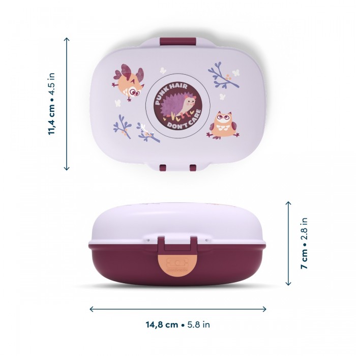 À l'heure du goûter, la chouette starlette de la boite à gouter personnalisable invite ses amis la chauve-souris, la loutre et le hérisson à rigoler autour d'un encas gourmand ! Invitez les enfants à développer leur imagination avec la MB Gram mauve Owly !