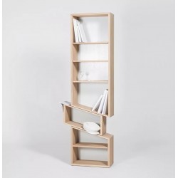 Suite à un glissement, le corps de la bibliothèque SLIDE s’est décalé. De simple caisson rectangle, elle devient une bibliothèque originale mais fonctionnelle.