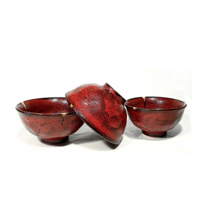 Bol en grès blanc, décor rustique rouge sang et petites traces blanches et noires, made in Japan.