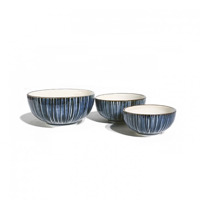 Petit bol japonais en porcelaine épaisse, décoré de lignes bleues verticales.