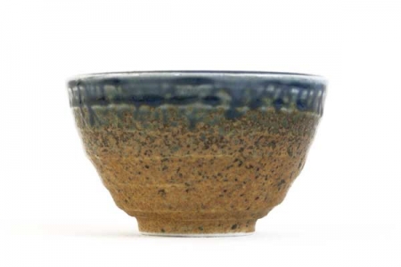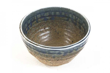 Petit bol en grès du Japon, en grès émaillé ocre et bord bleu, pour le riz ou autres mets.