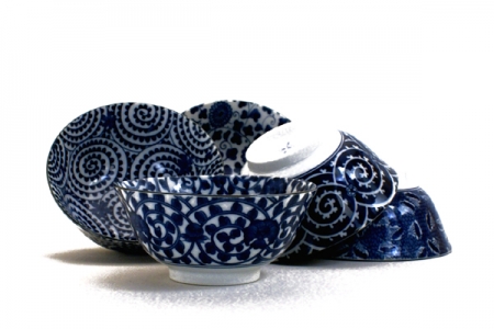 Set de cinq bols en porcelaine de qualité, avec décor traditionnel japonais dlfférent sur chaque bol.