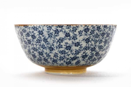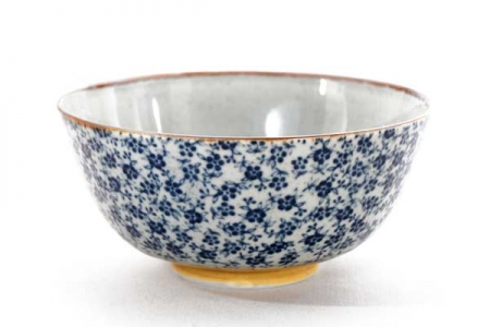 Bol é riz en grès fin décoré de petites fleures bleues.