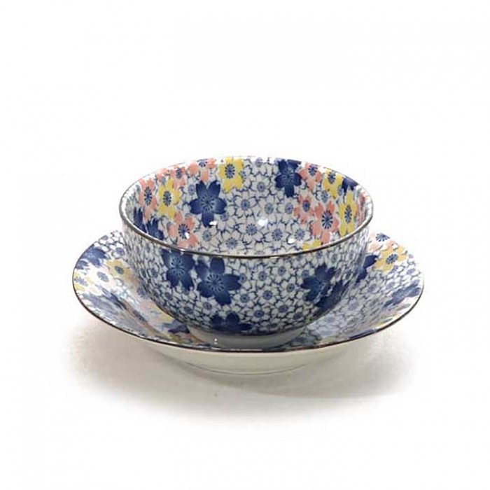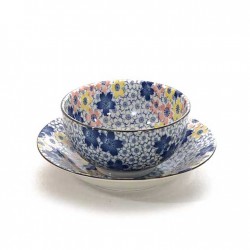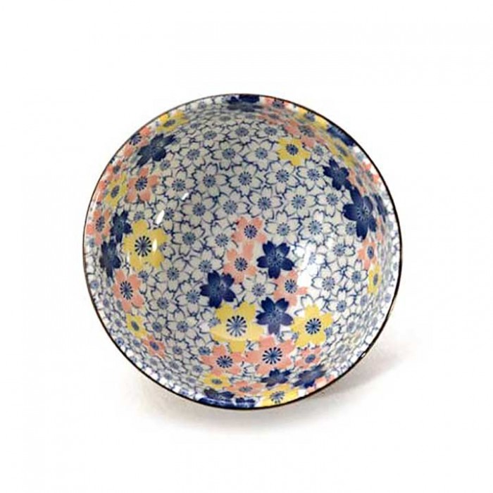 Bol en porcelaine décorée de fleurs de cerisier bleues à l'extérieur et en couleurs "pastel" à l'intérieur.