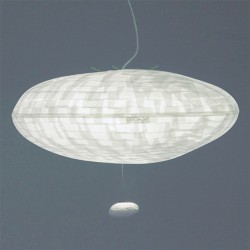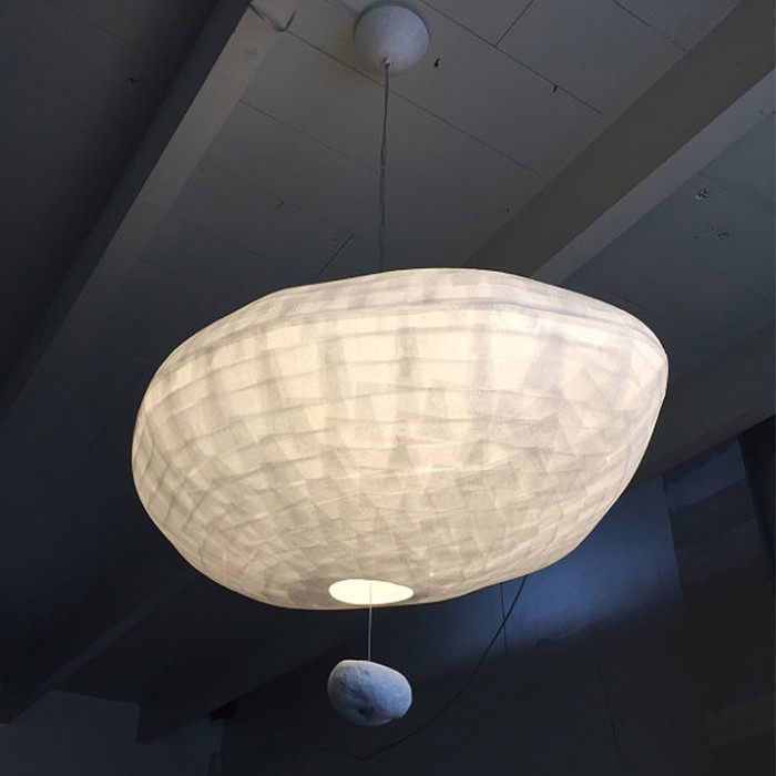 Entièrement réalisée à la main, la suspension CUMULUS est équipée d’un système monte et baisse, lesté par un galet de marbre blanc. Il est possible de de demander ce luminaire sans galet et même complètement fermés (envoyer un mail à : makoura@bluewin.ch).