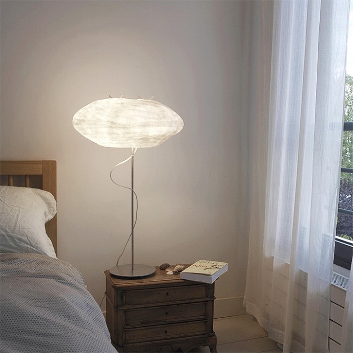 La lampe à poser « Giboulée » apporte un éclairage chaleureux à placer près d’un lit ou sur un bureau. Le cocon est suspendu par deux brins d’osier à une tige émergeant d’un socle en inox brossé. Le câble d’alimentation cristal serpente le long de la tige.