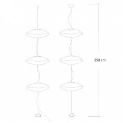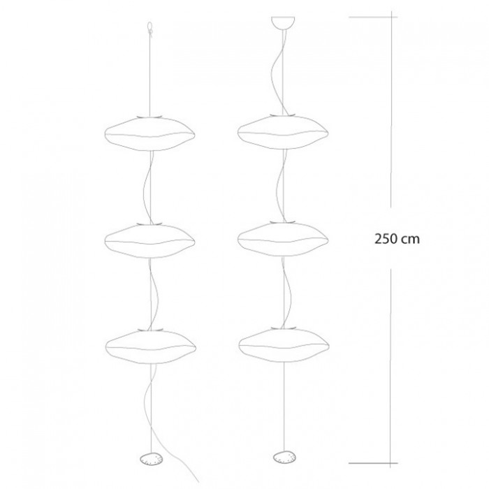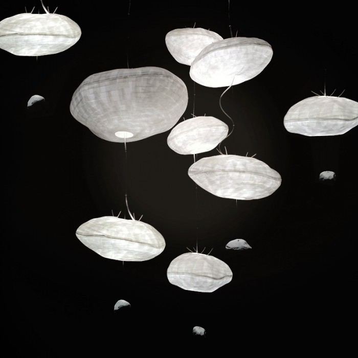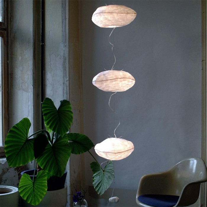Les trois cocons flottent dans l'espace soutenus par un câble et alimentés par un fil irisé qui serpente entre les coques. La guirlande se fixe au plafond avec un crochet. L'espacement des galets est réglable. Les abat-jours en papier japonais sont fabriqués à la main