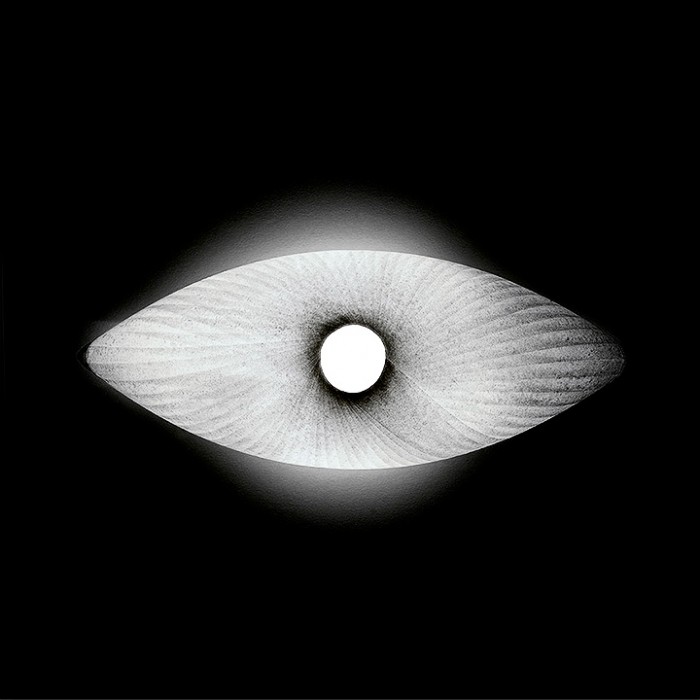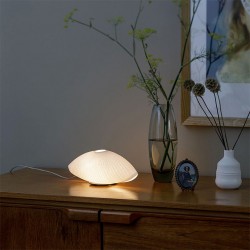 L’abat-jour en papier japonais est fabriqué à la main, chaque pièce est unique par son modelé et sa texture. La disposition rayonnante des bandelettes souligne sa forme oblongue. Le luminaire peut être utilisé posé ou fixé au mur.