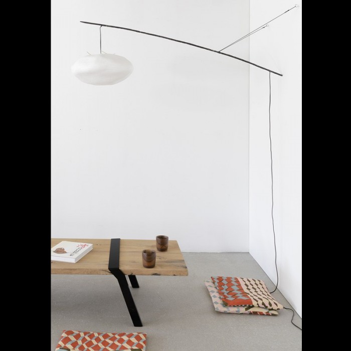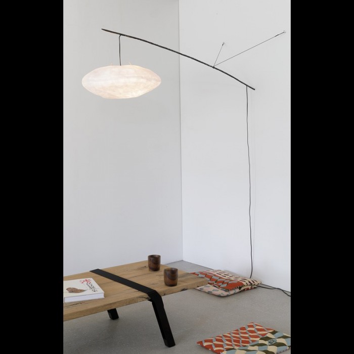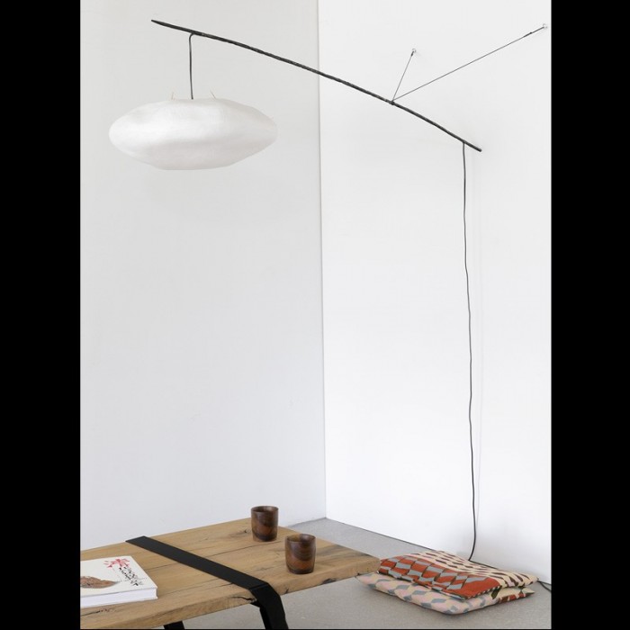 La structure, d’une grande simplicité, est composée d’un tube d’acier, de cordelette, et d’un astucieux système de noeud, qui permet de maintenir la perche en appui sur le mur. La tige, parfaitement stable et d’une grande légèreté structurelle, permet de suspendre délicatement à une grande distance du mur l’abat jour en papier japonais. Le système est orientable grâce au noeud coulissant qui maintient la tige.