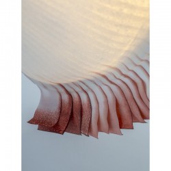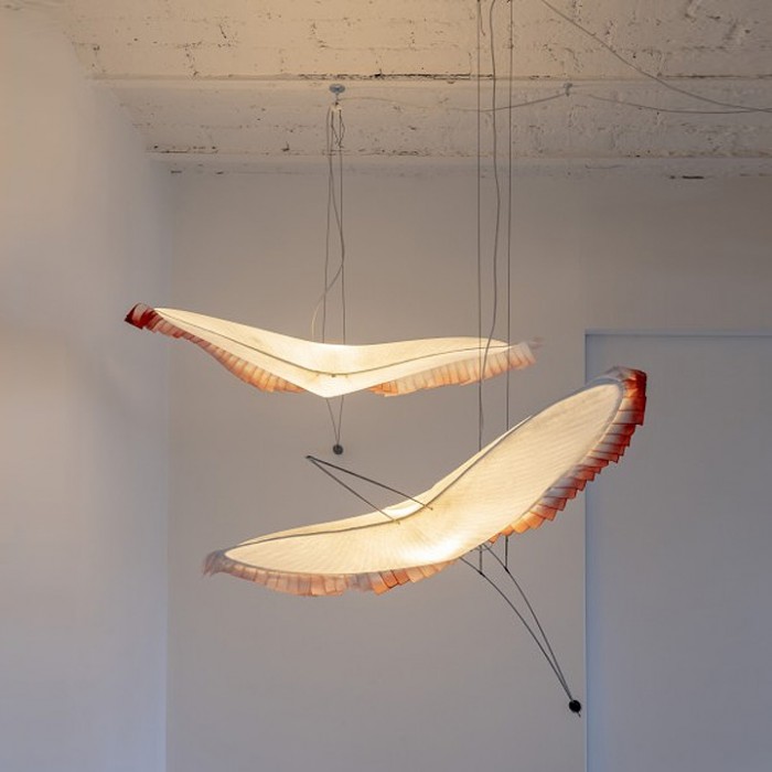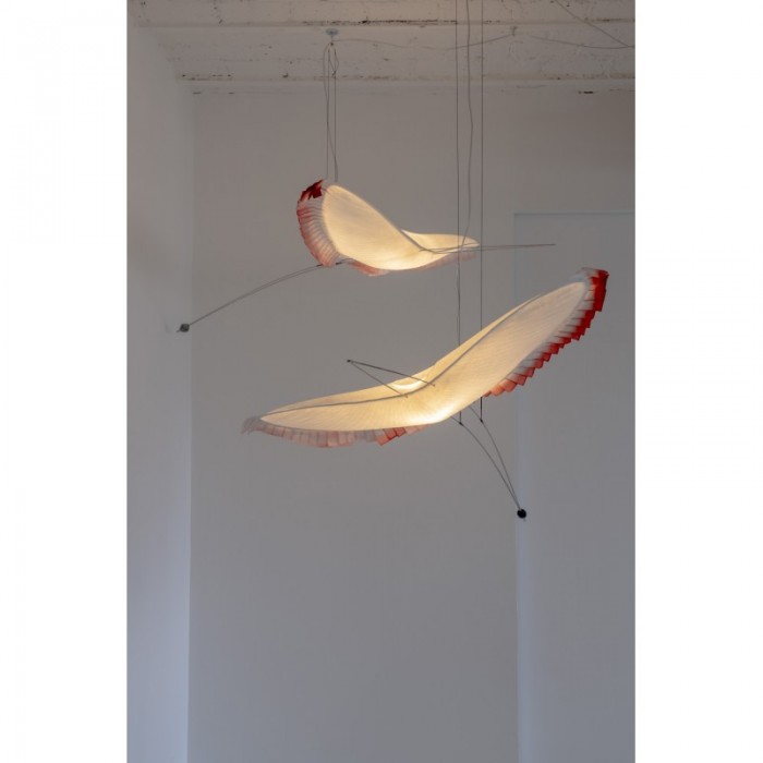 Ce luminaire prend la forme délicate d'un oiseau en vol, la lumière émanant du centre. Les plumes des oiseaux se parent de rouge coquelicot au rouge brique, deviennent Tsuru, grue du Japon.