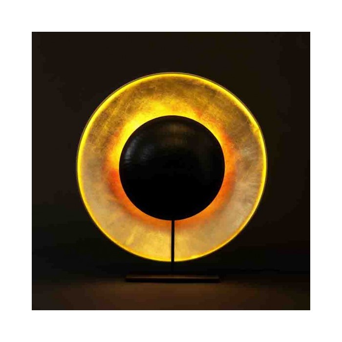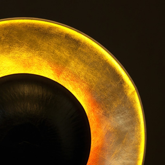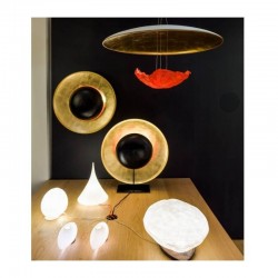 Une structure légère en acier aimanté supporte une grande coupole de papier doré. Une autre coupole noire plus petite et inversée projette une lumière chatoyante sur la partie supérieure.