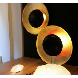 Abat-jour de 62 cm en papier japonais et tarlatane dorés à la feuille de cuivre, abat-jour de 35 cm en papier japonais teinté à l’encre noire et rouge, socle et tige acier noir. Câble alimentation gainé tissu noir.