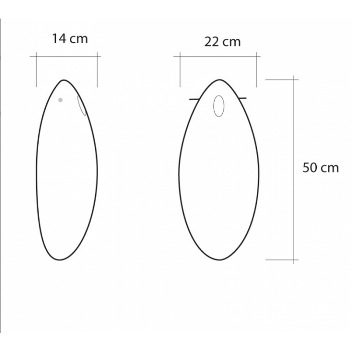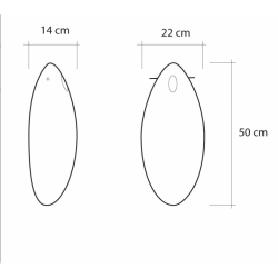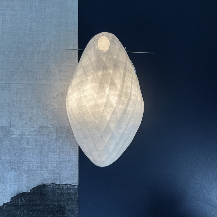 L’abat-jour oblong est suspendu par une légère tige traversante en inox.
