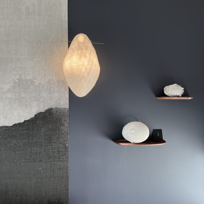 Applique en papier japonais moulé dont la structure en bandelettes s’inspire des brindilles d’un nid.
