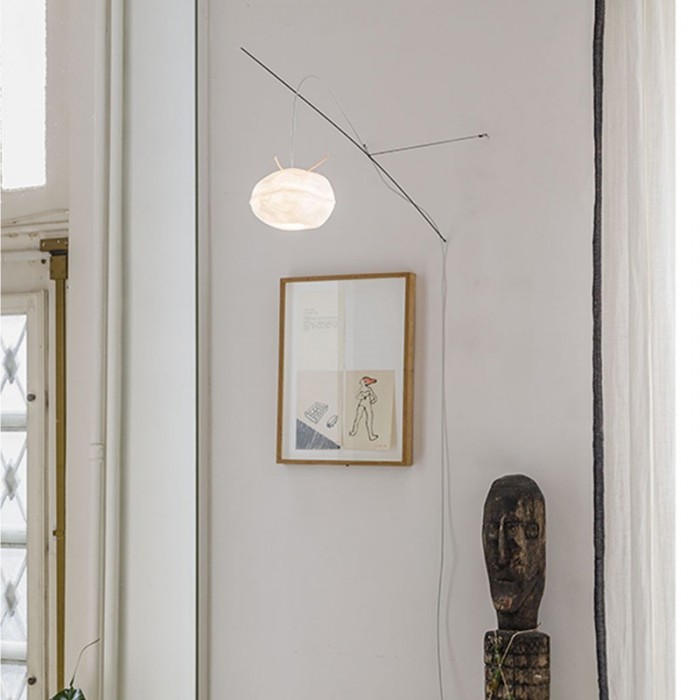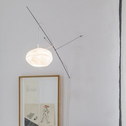 Une structure d’une grande simplicité, composée d’une légère tige d’acier noire, de cordelette, et d’un astucieux système de noeud, permet de maintenir la perche en appui sur le mur. Un cocon y est délicatement suspendu. L’orientation est réglable.