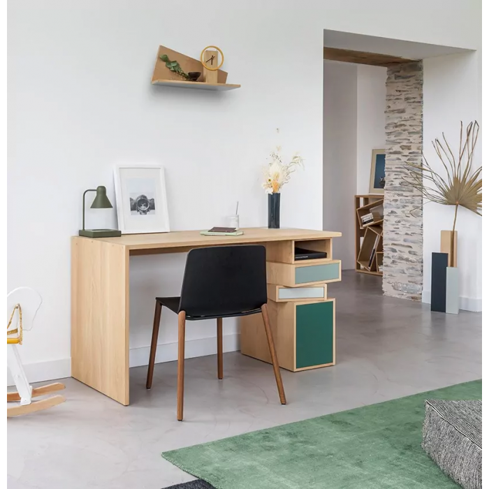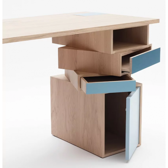 Opposition entre un côté sobre et un côté désordonné, le bureau EMPIL joue sur les contrastes. Composé de 3 caissons que l’on fait pivoter à sa guise, il offre les fonctionnalités d’un bureau classique. Le dessus est équipé d’une prise pour brancher ou recharger son portable.