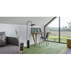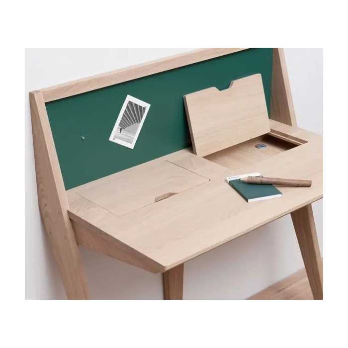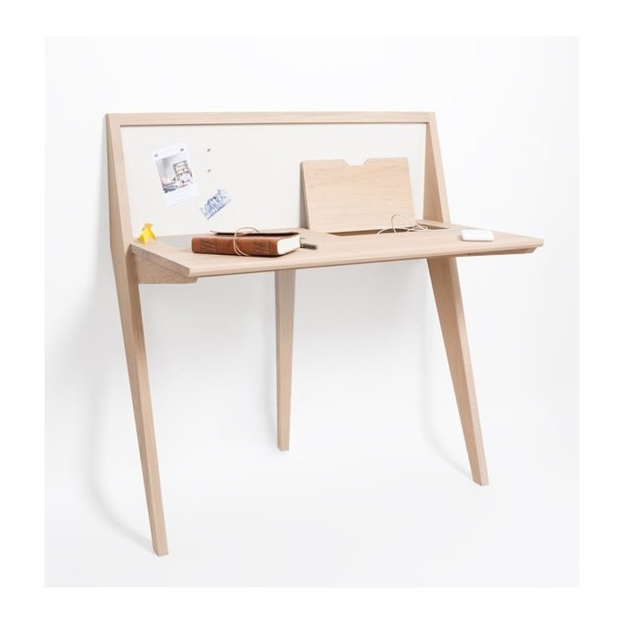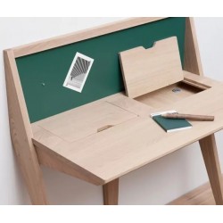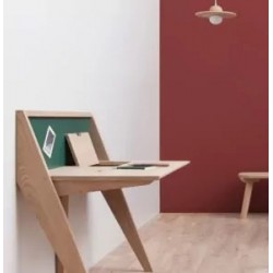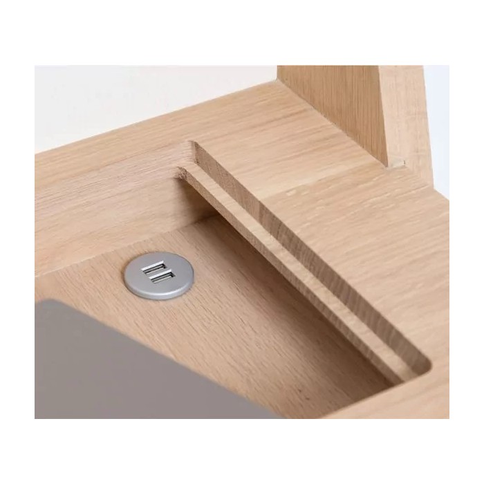 Adossé au mur, le bureau COMPAS s’accommode des espaces réduits. D’aspect sobre, il cache bien ses atouts : 2 trappes amovibles pour accéder à des espaces de rangement pour les portables, tablettes, crayons, papiers, un port USB pour recharger les batteries et une surface aimantée pour accrocher cartes et documents.