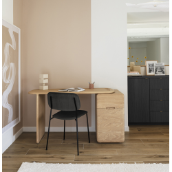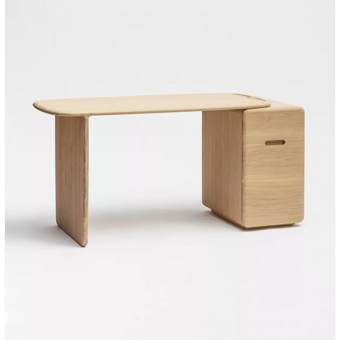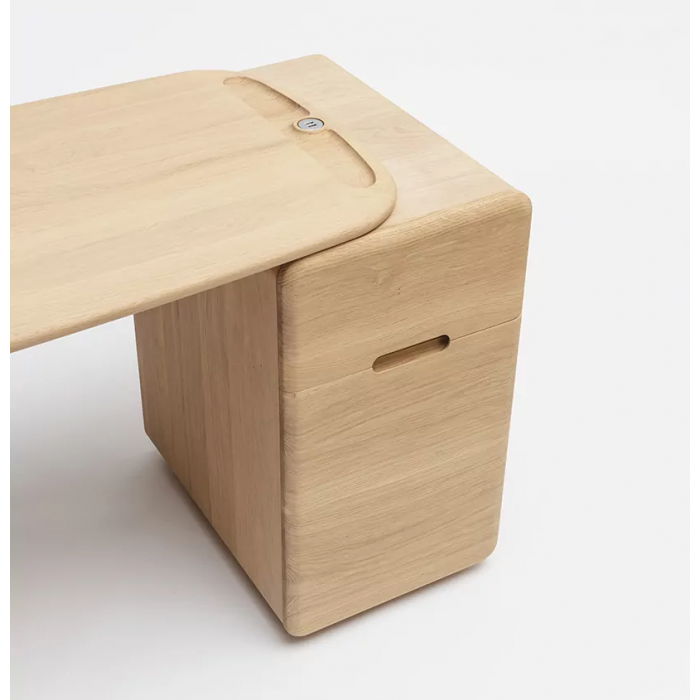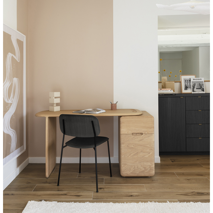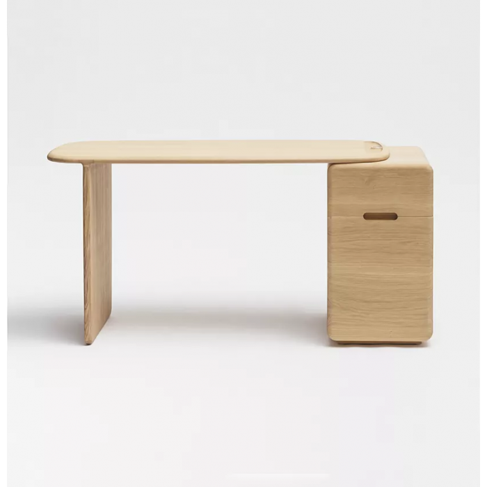 Dans la lignée des créations TÉHÈME avec ses formes organiques et douces, le bureau apporte la fonctionnalité en plus : le port USB est directement intégré au plateau ; un grand tiroir sur coulisse avec amortisseur et une porte permettent un rangement accessible. Le chêne naturel massif est mis en valeur par les détails d’assemblage, les poignées usinées dans l’épaisseur du bois et le range-crayon creusé dans le plateau. Travail manuel artisanal et précision des machines à commande numérique cohabitent pour faire de ce bureau un meuble d’exception.