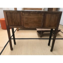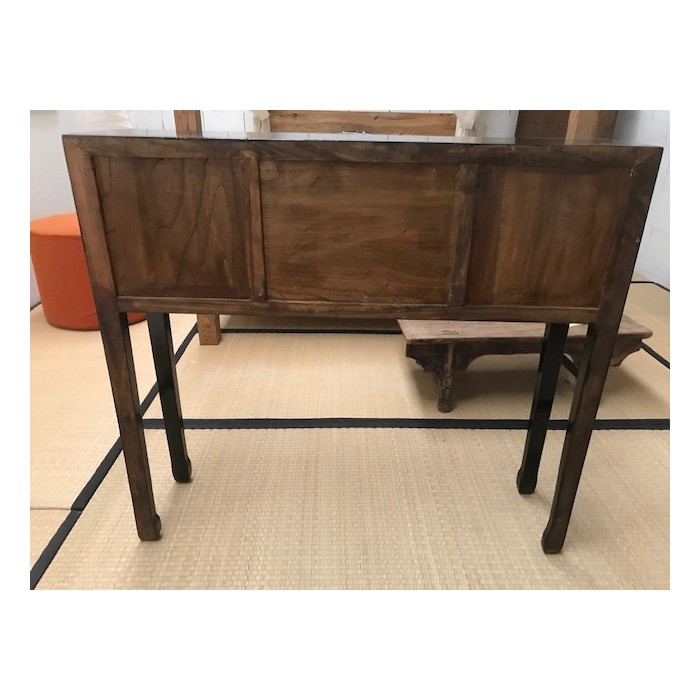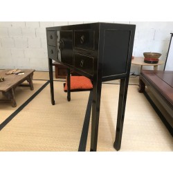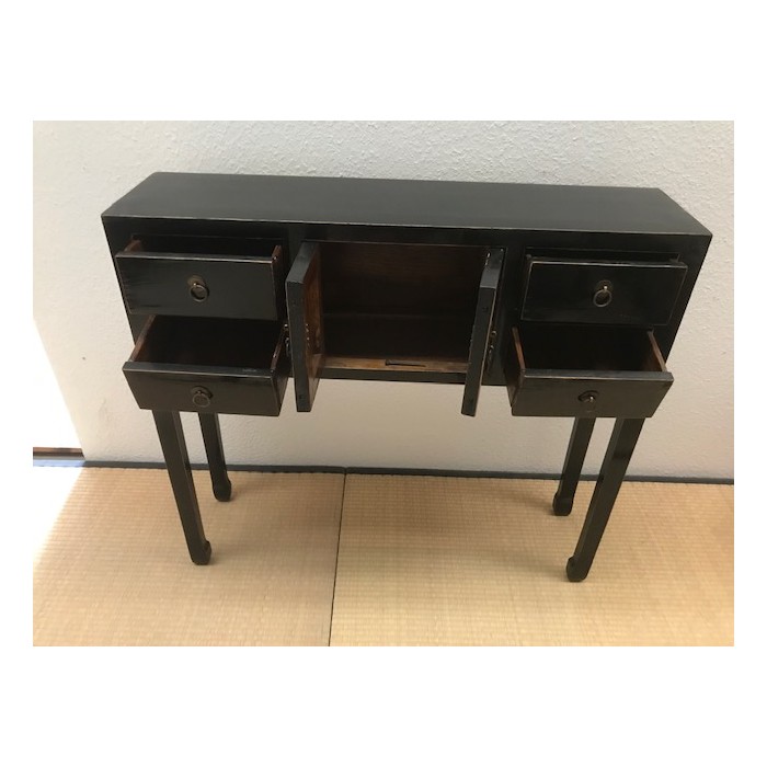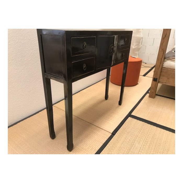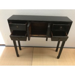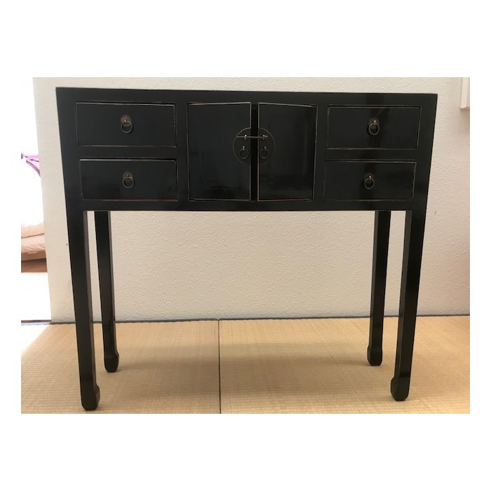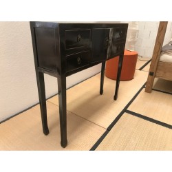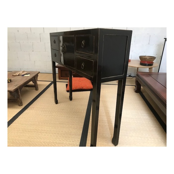 Cette console chinoise en orme laqué de couleur noire est dotée de 2 portes et 4 petits tiroirs. Cette console existe aussi en d'autres couleurs.