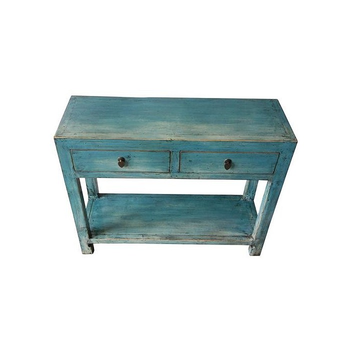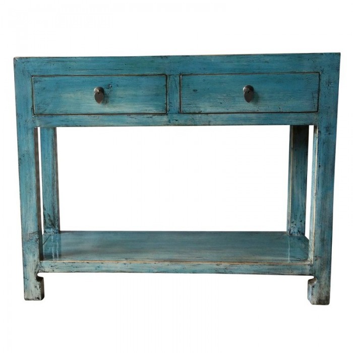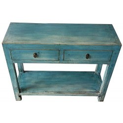 Console chinoise bleu turquoise en vieux pin, 2 tiroirs et une étagère