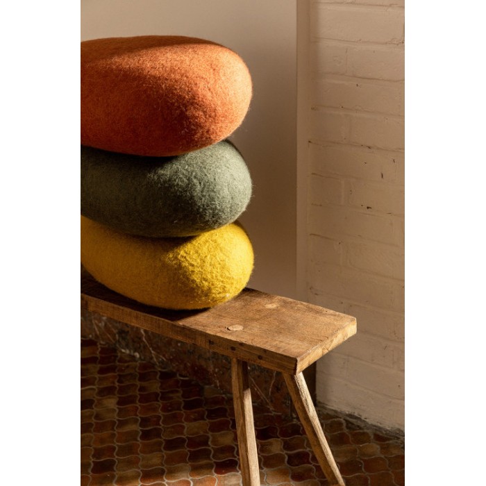Sa fabrication est entièrement artisanale. A partir de laine de mouton cardée, d’eau et de savon, un long travail de pression et de friction permet aux fibres de laine de s’entrelacer pour obtenir une matière moelleuse, à la douceur généreuse. Sain pour l’environnement, le feutre est un excellent isolant thermique et phonique. C’est également une fibre naturelle anallergique ne favorisant pas la prolifération des bactéries ou des acariens, et ne dégageant aucune substance nuisible.