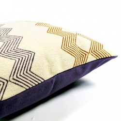 Coussin en toile naturelle imprimée au block print de motifs géométriques violet bleu et ocre. Le verso est coupé dans la même toile unie, couleur violet bleu. Coussin déhoussable 50x50 cm, zip invisible, 100% coton. Lavage à la main conseillé, ou à 30°C en machine, cycle délicat.