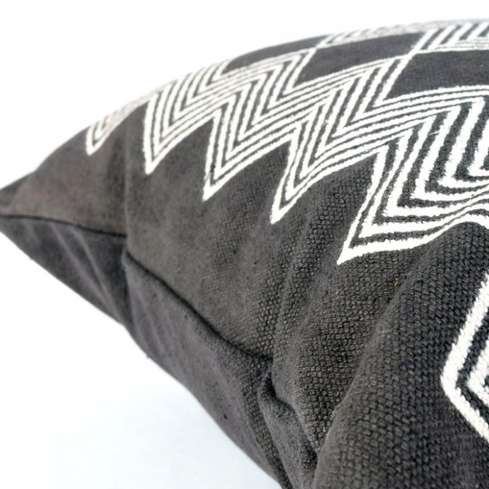 Coussin déhoussable en toile teinte couleur charbon. L'impression de motifs géométriques écrus est faite à la main, selon la technique du block print. Coussin déhoussable 50x50 cm, zip invisible, 100% coton. Lavage à la main conseillé, ou à 30°C en machine, cycle délicat.
