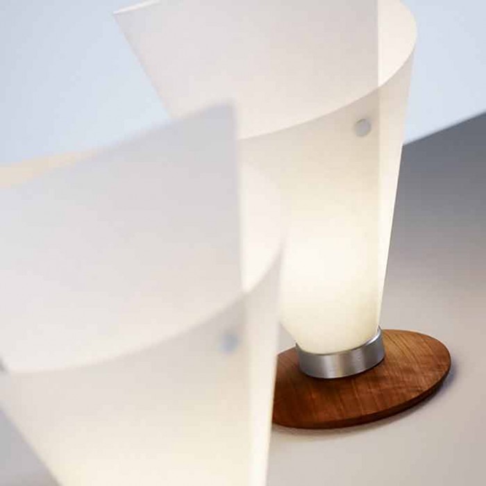 La feuille de Lunopal, laisse passer la lumière comme si elle était filtrée par du papier japonais. Le Lunopal est un matériau robuste, qui ne jaunit pas et qui peut se rincer. Le socle en bois tourné manuellement dans les ateliers de DOMUS, maintient l'abat-jour, et lui donne à la lampe son aspect naturel.