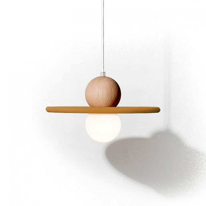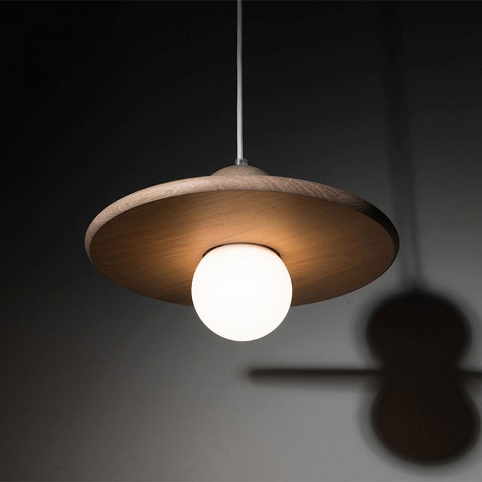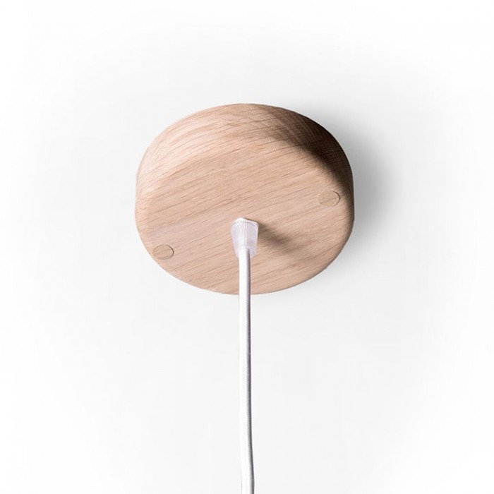 La suspension NÉBULEUSE est fournie avec platine en chêne et visserie pour fixation au plafond avec 150 cm de câble (cordon textile). Ampoule globe LED fournie (Warm white, 1000 lumens 2700 ° K, val. 72 W). En chêne 100 % massif.