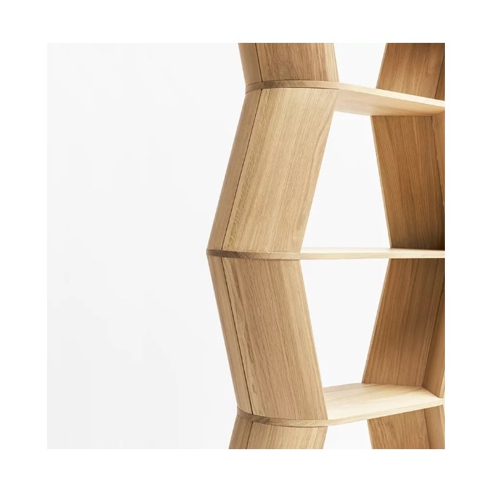 La bibliothèque LOFT est conçue sur un principe de répétition très sculptural. Ses contours obliques forment une silhouette graphique et mettent en valeur des pièces généreuses en bois massif. Selon le point de vue, le volume se dessine, jouant sur les pleins et les vides.