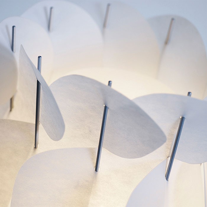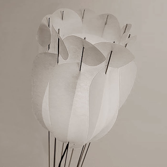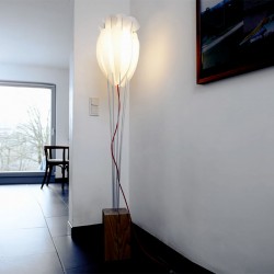 Magnifique solution d'éclairage, très élégante pour le salon, avec une belle sélection de matériaux. Les tiges de métal font un contraste intéressant avec le pied en une seule pièce de chêne massif, et l'abat-jour en Lunopal. Sa flexibilité lui donne cet air naturel de légèreté de la fleur.