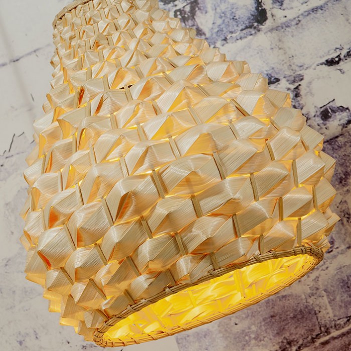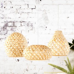 Cette suspension en forme de goutte, est manufacturée avec de la fibre de bambou naturelle, selon une technique japonaise, genre origami.