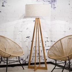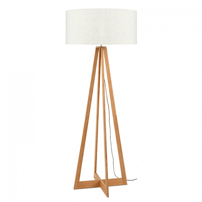 Le lampadaire Everest, de Good & Mojo, est un assemblage de bambou en forme de pyramide, surmonté d'un abat-jour cylindrique en toile. Ce modèle existe en lampe de table.