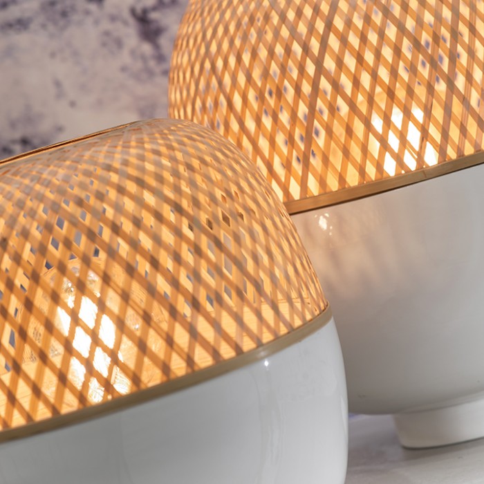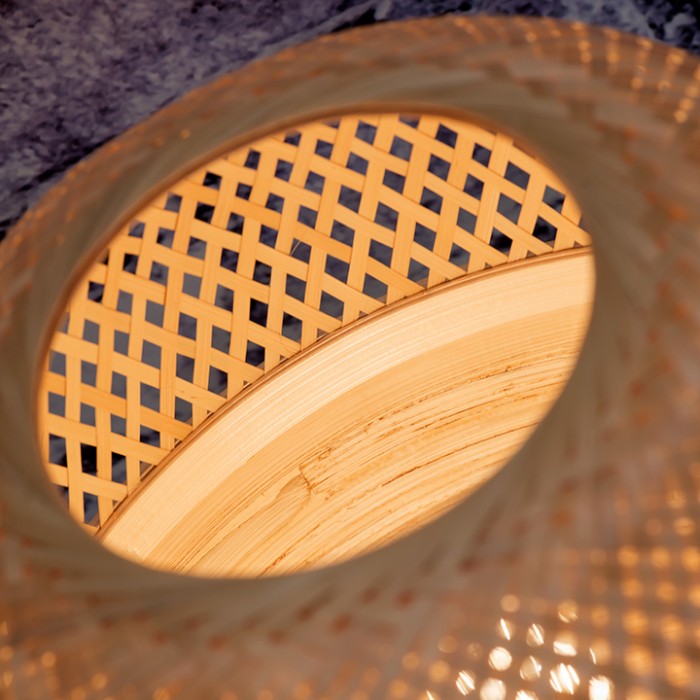 Lampe de table originale en bambou; posée sur une table, sur un rayonnage ou au sol, elle dégagera son jeu de lumière en embaumant de rayons chaleureux l'espace.