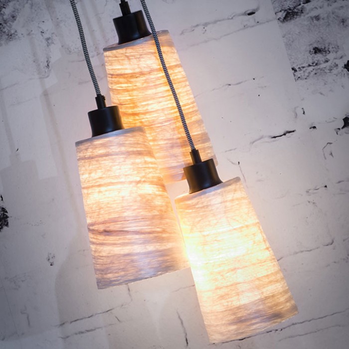 Groupe de trois abats-jour en abaca, le chanvre de Manille naturel, diffusant une belle lumière chaleureuse.