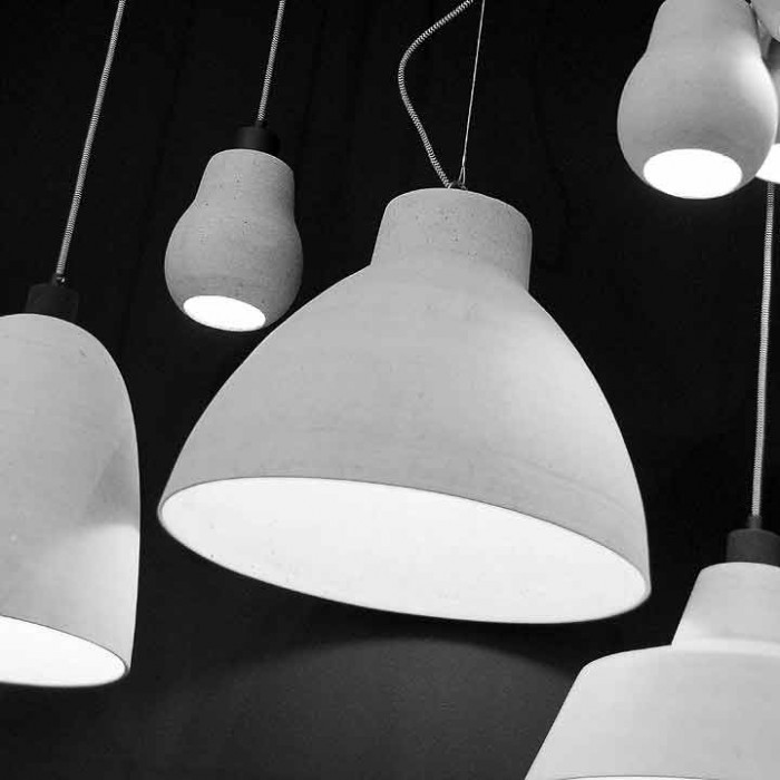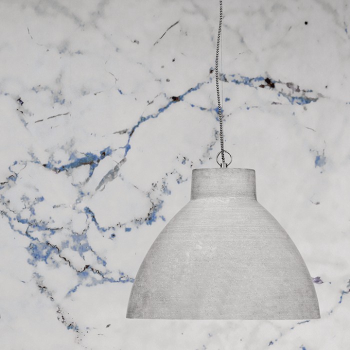L'abat-jour est en polystone, pierre broyée et résine synthétique, lui donnant l'aspect de béton.