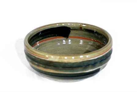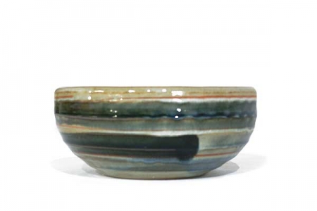 Bol en grès émaillé beige-vert avec un décor horizontal bleu-vert.