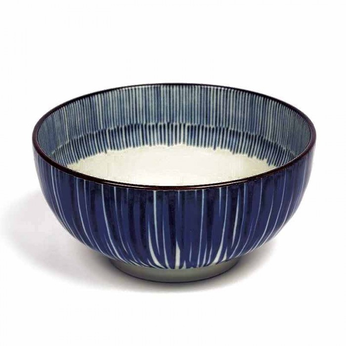 Magnifique bol en porcelaine épaisse, décoré de lignes bleues verticales, à l'intérieur comme à l'extérieur.