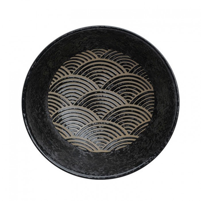 Grand bol à ramen japonais ou saladier, en porcelaine opaque émaillée noire et fond vagues beiges. Lave-vaisselle et micro-onde.