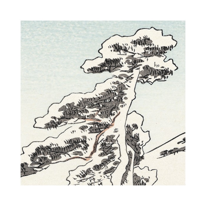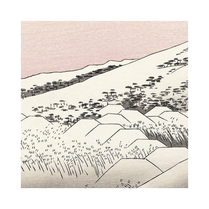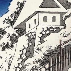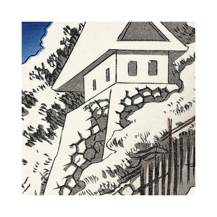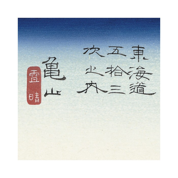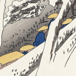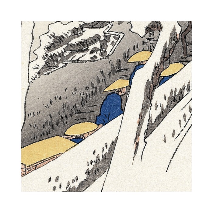 La colline escarpée s'étend vers la droite, avec de grands pins et un château au-dessus. Une procession est représentée montant jusqu'au château. En bas, à gauche, se trouve un village. La lueur rose à l’horizon suggère un petit matin sous un ciel clair après de fortes chutes de neige. C'est un autre chef-d'œuvre de la série Tokaido.