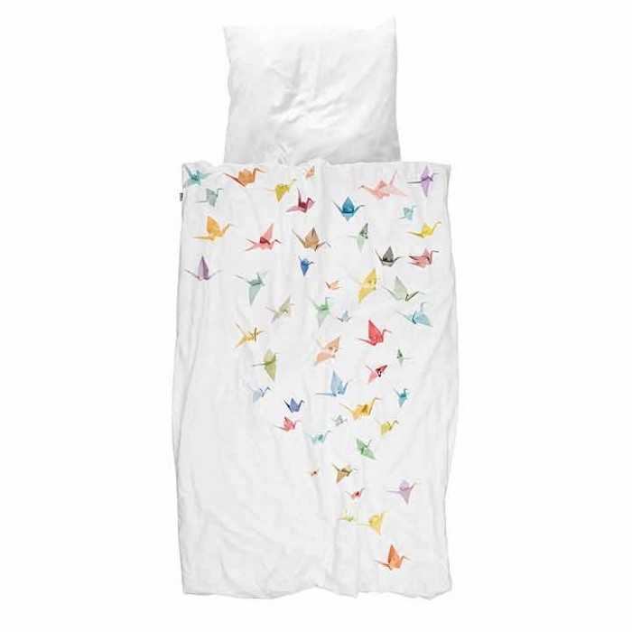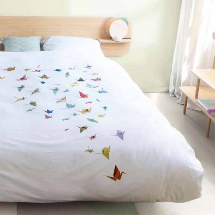 Clin d’œil au Japon par les origamis colorés, un envol de grues genre cocote, rafraichissant sur un fond blanc.