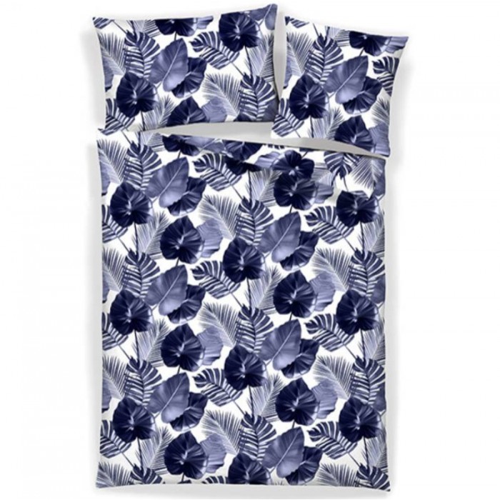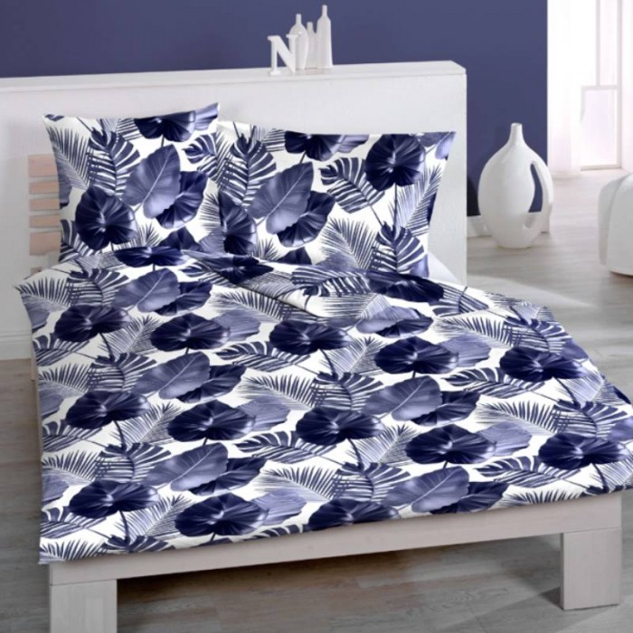 Particulièrement doux, ce linge de lit en satin « Blues » aux feuilles sauvages dans les tons violet clair et foncé sur fond blanc apporte une touche exotique à votre chambre.